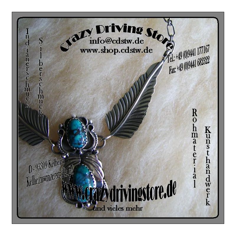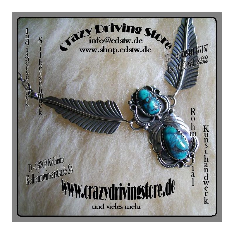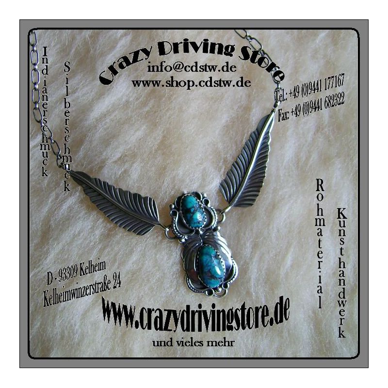 Beschreibung : Collier , 2 eingeschliffene Türkise , sehr schön verziert , Motiv: Blätter und Blumen , Kettenlänge individuell verstellbar durch Einhängen in die Kettenglieder ,Verschluß: Federring